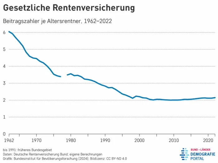 Für 2022 weist das Demografie-Portal 39,9 Millionen Beitragszahler und 18,6 Millionen Rentenempfänger aus. Das entspricht in etwa über zwei Erwerbstätige je Rentner. Genau dieser Rückgang der Einzahler im Verhältnis zu den Empfängern ist das Hauptproblem, das dem Umlageverfahren schleichend seine Stabilität entzieht.