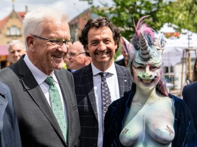 Vielmehr habe der Auftritt der Gartenschau selbst und auch den anderen 15 teilnehmenden Gemeinden die Schau gestohlen: Die kursierenden Fotos zur Eröffnung am vorigen Freitag konzentrierten sich auf den lachenden Ministerpräsidenten Winfried Kretschmann (Grüne), neben ihm die fröhliche Cynthia Schneider mit Strass und Schmetterlingen auf der nackten Brust und Einhorn auf der Stirn.