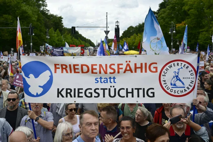 Demonstranten halten ein Transparent mit der Aufschrift „Friedensfähig statt Kriegstüchtig“ während einer Friedenskundgebung am 13. September 2025 am Brandenburger Tor in Berlin.
