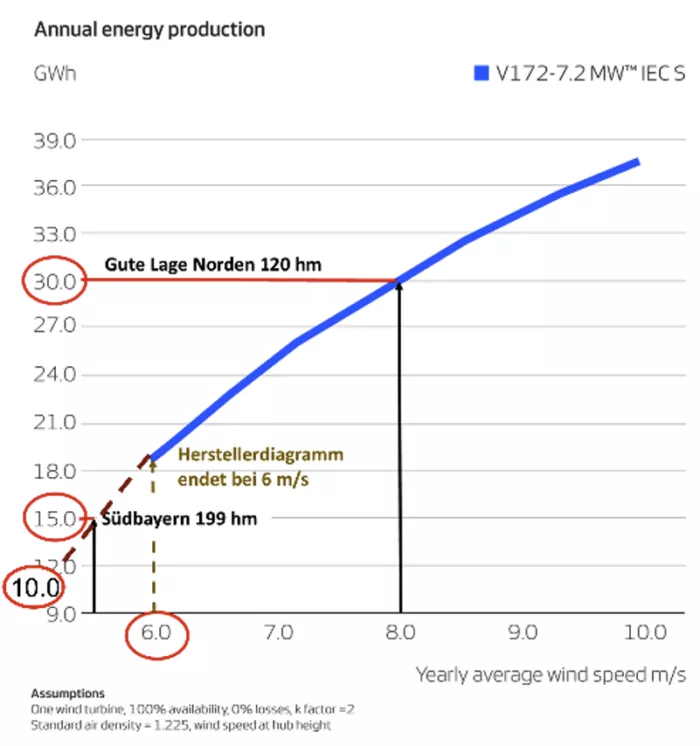 Nimmt man zum Beispiel die Anlage EnVentus V172-7.2 MW, eine Windkraftanlage für Schwachwind, so endet das Diagramm des Herstellers bei 6,0 m/s durchschnittlicher Windgeschwindigkeit. Also selbst der Hersteller kann sich nicht vorstellen, dass jemand bei noch weniger Wind ein Windrad baut.