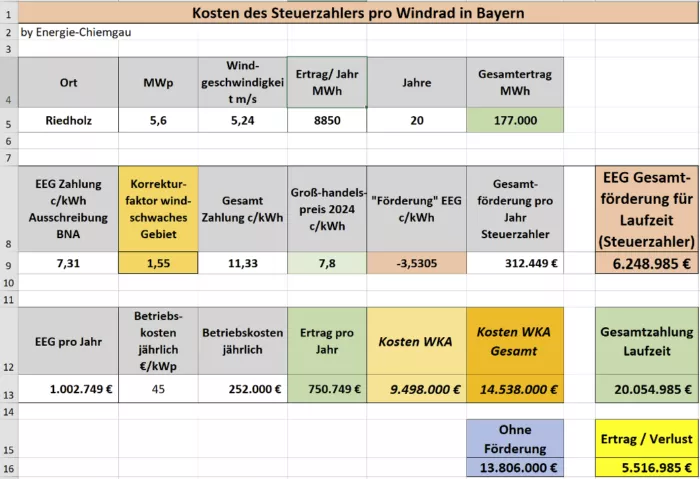 Dass er dieses Windrad voraussichtlich mit circa 6 Millionen Euro Steuern in 20 Jahren bezuschusst, plus 1,8 Millionen Euro Mehrwertsteuer, die der Betreiber nicht zahlen muss. Und das für ein Windrad – in Zahlen: eins. Ohne diese Beteiligung würde diese Anlage Verluste erleiden.