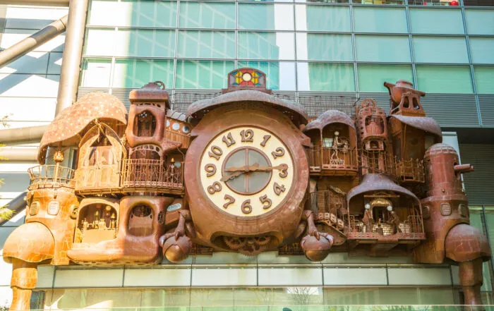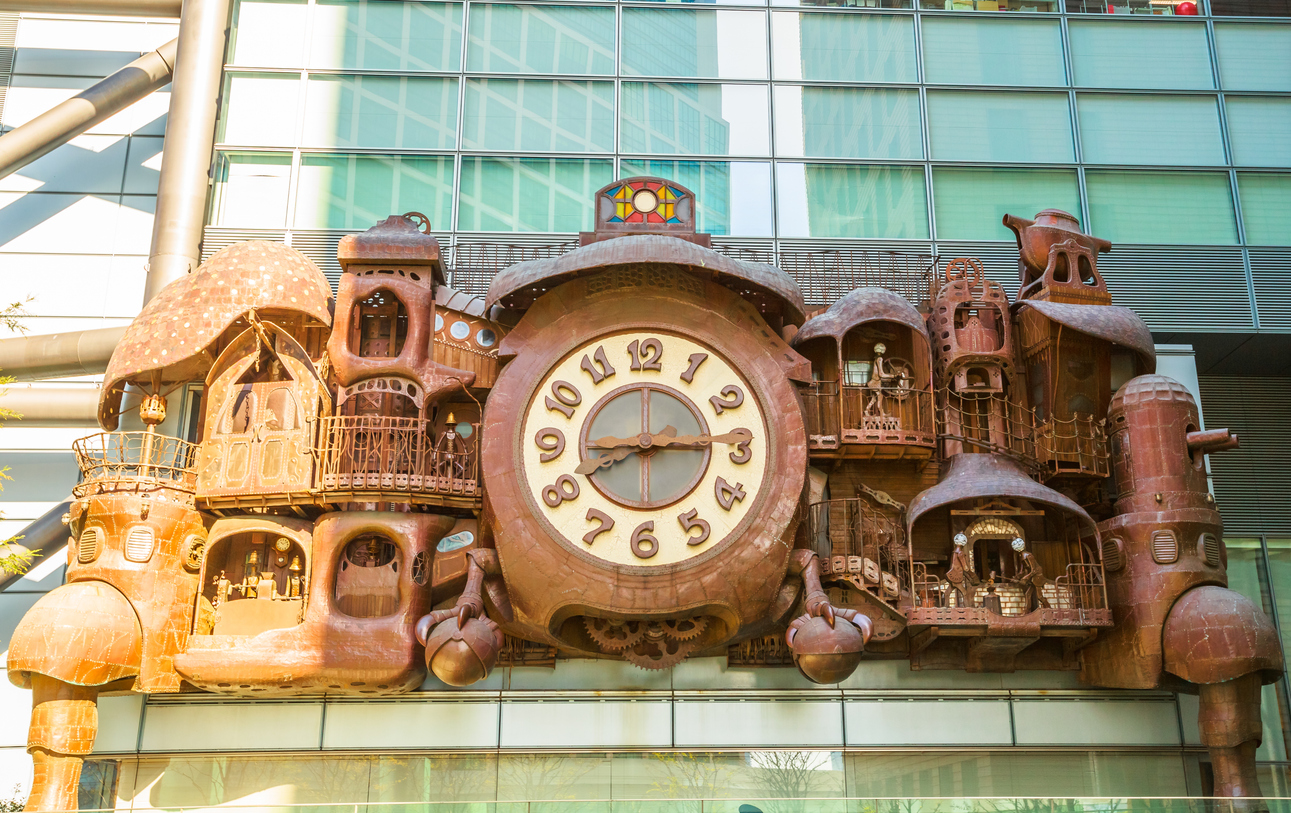 Eine Kuckucksuhr in Tokio, Japan: Die Riesige Ghibli-Uhr an der Fassade des Nittele Tower, dem Hauptsitz von Nippon Television im Stadtteil Shiodome in Minato.