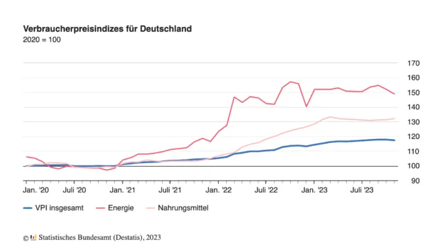 Wesentlich für die Preisrückgänge seit Oktober 2023 war das sehr hohe Niveau der Energiepreise 2022. Die Preise für Kraftstoffe gingen von November 2022 bis November 2023 um 6,9 Prozent zurück. Haushaltsenergie verbilligte sich im gleichen Zeitraum um 2,7 Prozent.