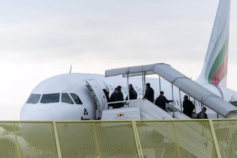 Abgelehnte Asylbewerber steigen im Rahmen einer Sammelabschiebung in ein Flugzeug.