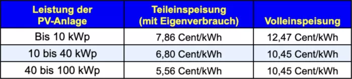 Für kleine Anlagen gibt es momentan 7,86 Cent pro Kilowattstunde, wie ein Vergütungsüberblick zeigt.