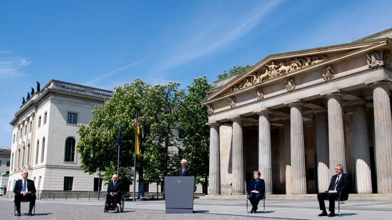 Die Corona-Pandemie zwinge Deutschland, „allein zu gedenken – getrennt von denen, die uns wichtig und denen wir dankbar sind“, sagte Steinmeier. „Vielleicht versetzt uns dieses Alleinsein noch einmal zurück an jenen 8. Mai 1945: Denn damals waren die Deutschen tatsächlich allein.“