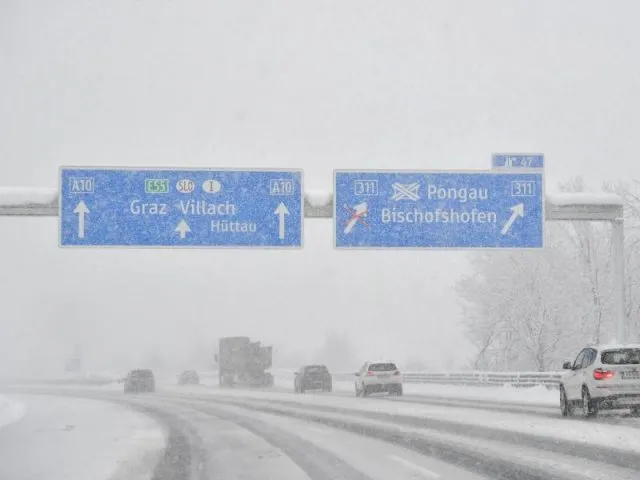 Autos sind bei Salzburg auf der verschneiten Autobahn unterwegs.
