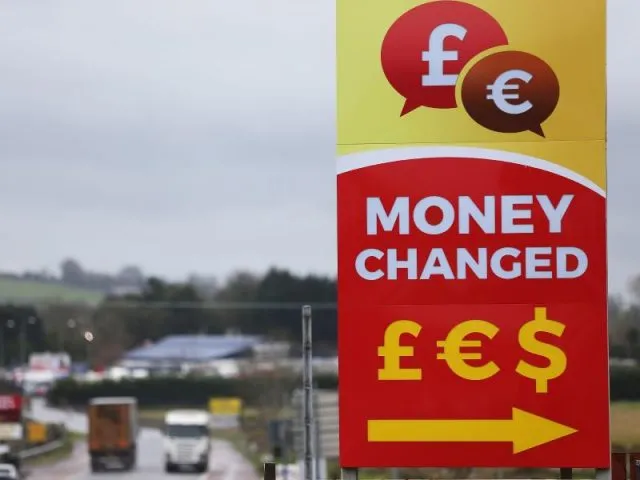 Werbetafel einer Wechselstube zum Tausch von Pfund und Euro an der Grenze zwischen der Republik Irland und der britischen Region Nordirland.