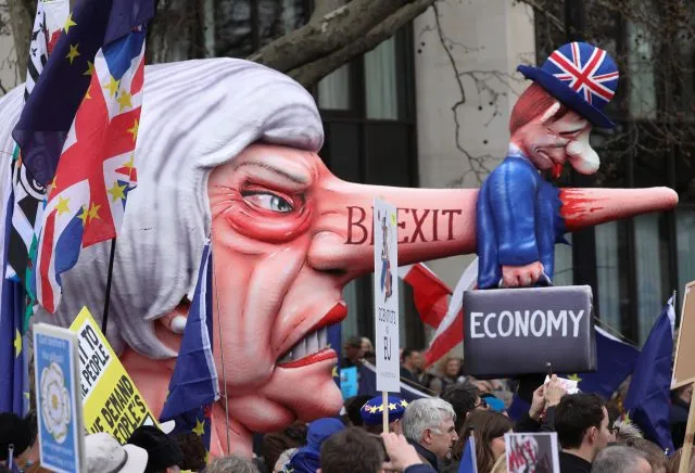 Ein Rosenmontagswagen des Düsseldorfer Künstlers Jacques Tilly war ebenfalls zu sehen. Der Motivwagen zeigt May, die mit einer langen Lügennase die britische Wirtschaft aufspießt. „Es ist schön, dass die Düsseldorfer Rosenmontagswagen auch ein Stück Weltgeschichte kommentieren“, sagte Tilly der Deutschen Presse-Agentur.