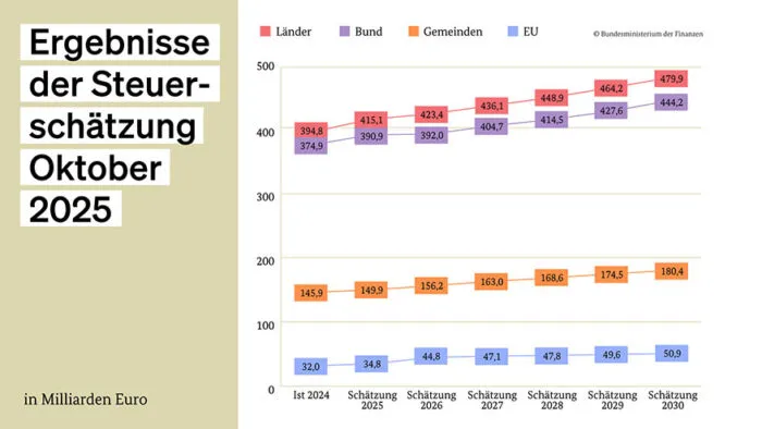 Die neue Schätzung zeigt auch eine Umverteilung der Einnahmen innerhalb des föderalen Systems. Länder und Gemeinden dürfen mit deutlich höheren Steuereinnahmen rechnen, vor allem durch steigende Anteile an Lohn- und Umsatzsteuern.