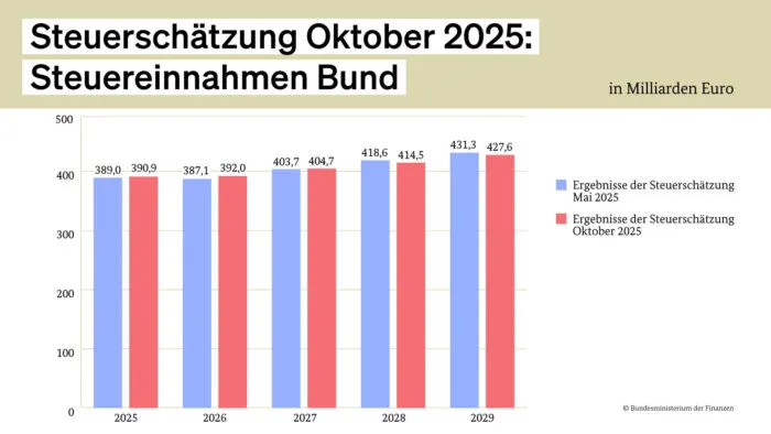 Für den Bund hingegen bleibt die Lage angespannt. Zwar verbessert sich das Steueraufkommen kurzfristig, doch ab 2028 werden die Einnahmen laut Prognose wieder unter den Werten der Mai-Schätzung liegen. Der Grund: wachsende Zinskosten, Ausgaben für das Investitionspaket und die Umsetzung bereits beschlossener Entlastungen.