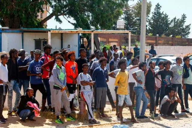 Migranten stehen am 3. Juli 2019 im Vorort Tajoura der Hauptstadt Tripolis innerhalb eines Flüchtlingslager, das von der libyschen Regierung des National Accord (GNA) genutzt wird. Eines der Gebäude soll in der Nacht durch einen Luftangriff getroffen worden sein wobei Dutzende Menschen getötet worden sein sollen. Der angriff wird Ex-General Khalifa Haftar angelastet.
