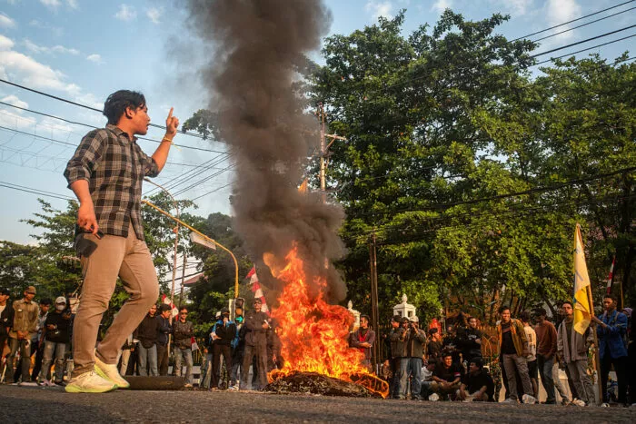 Studenten der Indonesischen Islamischen Studentenbewegung (PMII) verbrennen Reifen, während sie bei einem Protest gegen Polizeigewalt eine Hauptstraße der Provinz blockieren und vom Parlament eine Überprüfung seiner Politik fordern.