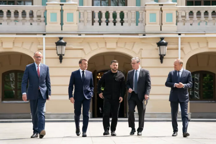 (von links nach rechts) Staatschefs aus Deutschland, Frankreich, Ukraine, Großbritannien und Polen treffen sich in Kiew, Ukraine, Mai 2025.