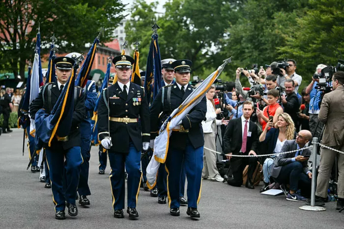 Eine Ehrengarde des US-Militärs marschiert am 18. August 2025 vor der Ankunft des ukrainischen Präsidenten Wolodymyr Selenskyj vor dem Westflügel des Weißen Hauses in Washington, D.C.