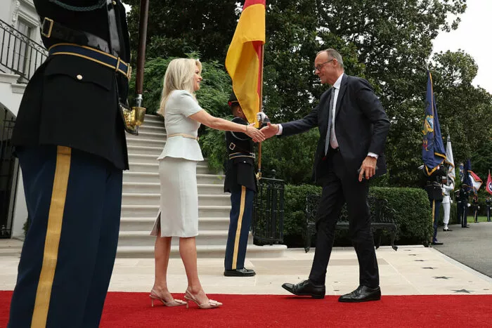 Bundeskanzler Friedrich Merz (rechts) wird von Monica Crowley, der Protokollchefin der Vereinigten Staaten, begrüßt, als er am 18. August 2025 in Washington, DC, zu dem Treffen mit US-Präsident Donald Trump und dem ukrainischen Präsidenten Wolodymyr Selenskyj im Weißen Haus eintrifft.