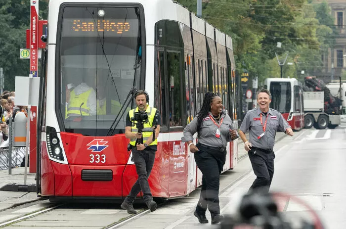 Die US-Straßenbahnfahrer Latisa Johnson und Josh Harris (r) vom Team „SanDiego“ am 13. September 2025 bei der Straßenbahnfahrer-Weltmeisterschaft 2025 vor dem Rathaus in Wien.
