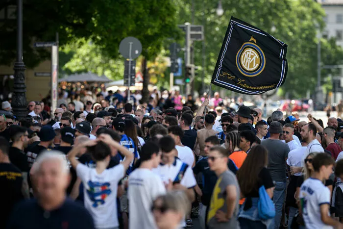 Fans des FC Internazionale Milano schwenken vor dem UEFA-Champions-League-Finale am 31. Mai 2025 in München eine Fahne in der Nähe des Wittelsbacher Platzes.