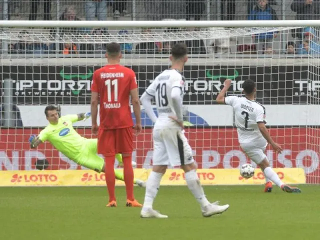 Sandhausens Andrew Wooten (r) verlädt Heidenheim-Keeper Kevin Müller.