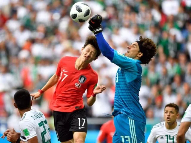 Mexiko-Keeper Guillermo Ochoa faustet – Südkoreas Jae-Song Lee kommt zu spät.