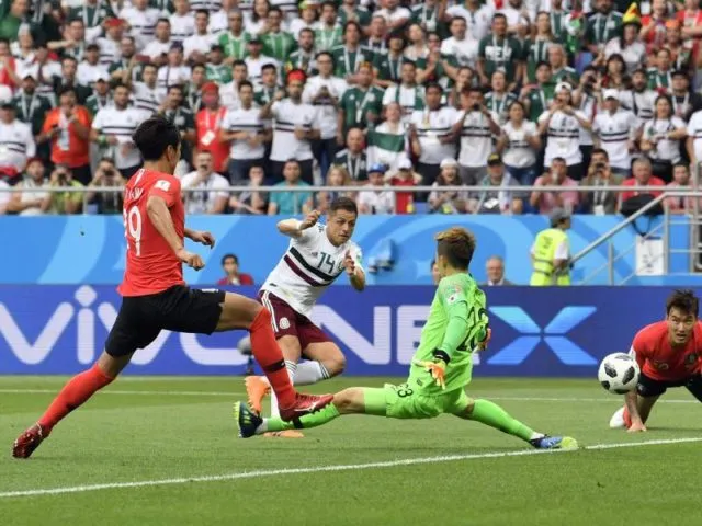 Zwar bot sich dem ehemaligen Leverkusener Heung-Min Son (22.) die erste gute Chance, doch Mexiko ging durch einen von Vela sicher verwandelten Strafstoß verdient in Führung. Zuvor hatte Hyun-Soo Jang den Ball an die Hand bekommen, Proteste gab es nach dem klaren Regelverstoß keine. Schon gegen Schweden hatte Südkorea das Gegentor nach einem Elfmeter hinnehmen müssen.
