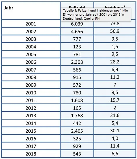 Masern-Fallzahl und -Inzidenzen pro 1 Mio Einwohner pro Jahr seit 2001 bis 2018 in Deutschland. Zahlen des Robert-Koch-Instituts.