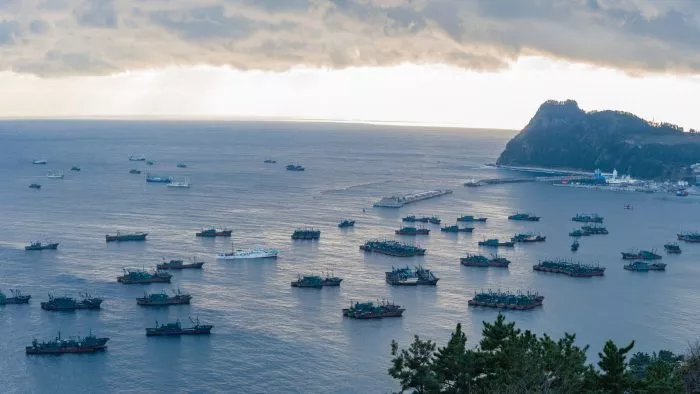 Chinesische Fischereischiffe vor Ulleung-do, Südkorea. Tausende Schiffe aus China fischen illegal in fremden Hoheitsgewässern.