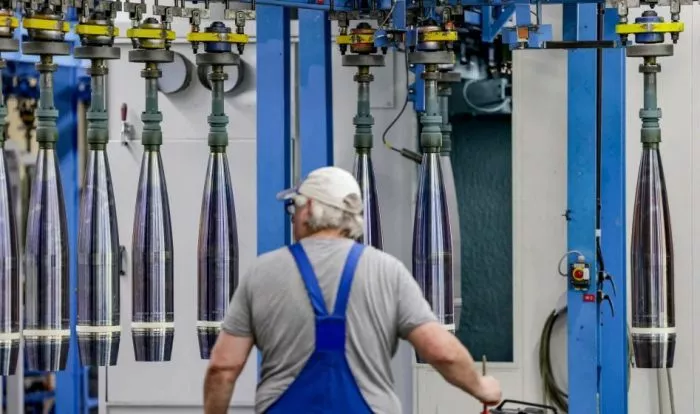 Ein Mitarbeiter von Rheinmetall arbeitet an 155-mm-Munition, die an die ukrainischen Streitkräfte für die Panzerhaubitze 2000, eine 155-mm-Selbstfahrhaubitze, geht. Das Bild entstand im Werk von Rheinmetall in Unterlüß, Norddeutschland.