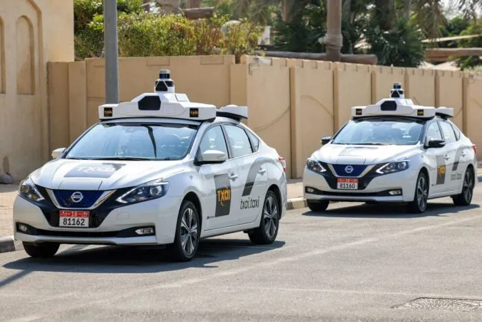 Einige der selbstfahrenden Taxis, die 2021 im Rahmen einer Technologiedemonstration in der Hauptstadt der Vereinigten Arabischen Emirate, Abu Dhabi, eingesetzt werden.
