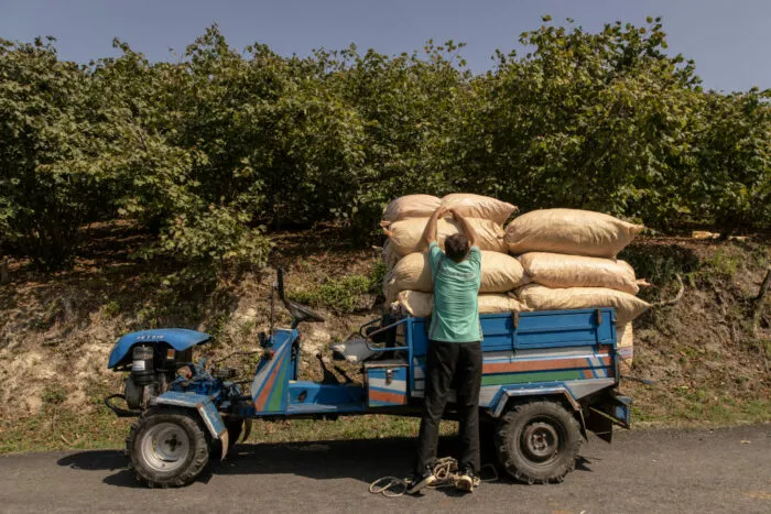 Ein Mann bereitet sich darauf vor, Säcke mit geernteten Haselnüssen zu transportieren. Das Bild stammt von der Ernte im August 2022 in Ordu, Türkei.