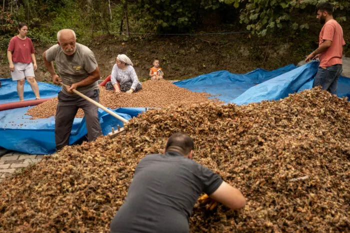 Der Haselnussbauer Yasar (2. l) harkt Haselnüsse zusammen, bevor er sie während der Ernte 2022 in Ordu, Türkei, von ihren Blättern trennt.
