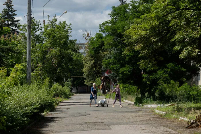 Zwei Frauen in der Nähe eines beschädigten Wohnhaus in der Stadt Lyman in der Nähe der Front in der Region Donezk am 24. Juni 2025.