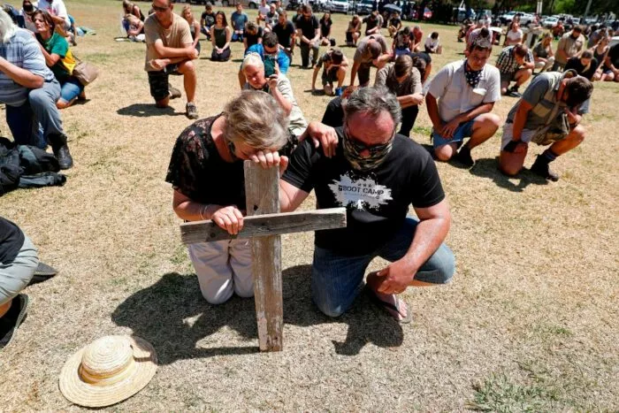 Landwirte knien während ihres Protestes gegen die Morde und Angriffe auf Farmen vor den Union Buildings in Pretoria am 10. Oktober 2020 nieder.