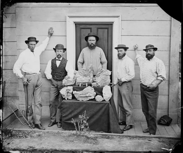 Bernhardt Holtermann (2. v. l.) und Hugo Louis Beyers (2. v. r.) mit einigen kleineren Funden aus der Star-of-Hope-Mine.