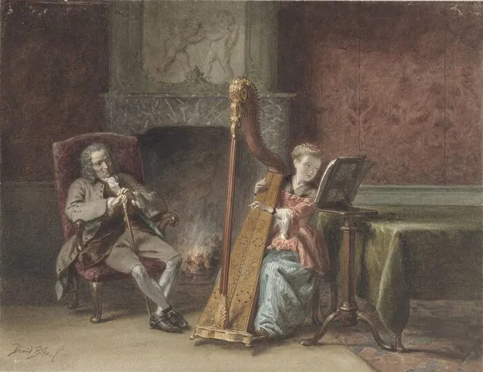 Das Gemälde von David Bles zeigt ein Mädchen, das das Harfenspiel übt.