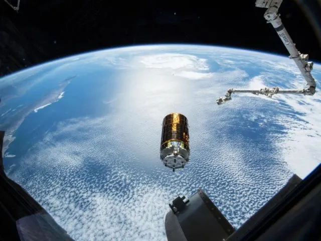 Der unbemannte japanische Raumtransporter H-II Transfer Vehicle-7 (HTV-7) beim Abdocken von der Internationalen Raumstation ISS.