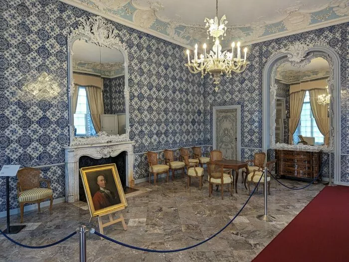 Ein privater, benachbarter Raum ist mit niederländischen Fliesen, einem venezianischen Kronleuchter und einem Marmorkamin ausgestattet und lädt zum Verweilen im Schloss Augustusburg ein.