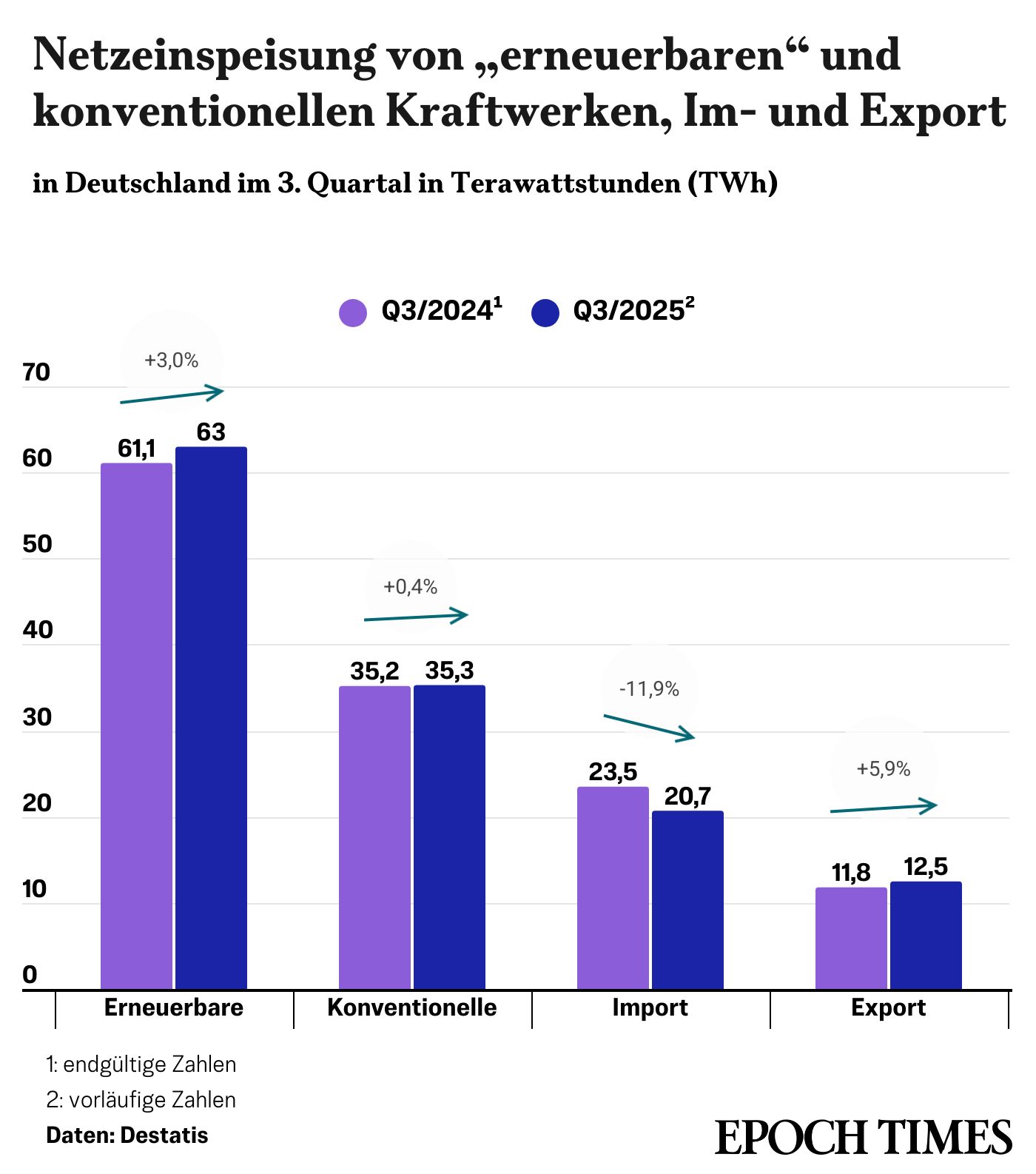 Netzeinspeisung von „erneuerbaren“ und konventionellen Kraftwerken in Deutschland im dritten Quartal 2024 und 2025 sowie der Stromimport und -export.