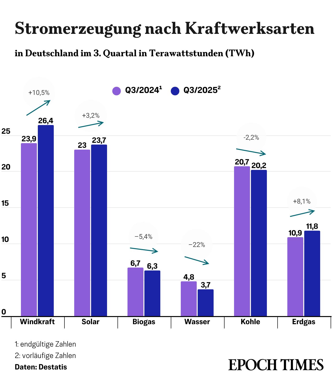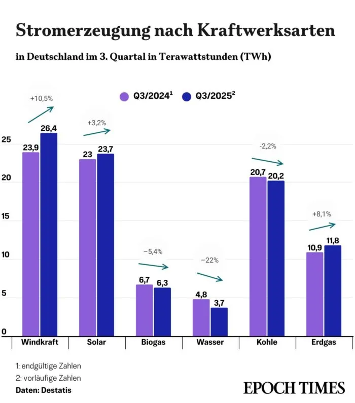 Neueste Daten zeigen, dass Windkraft und Photovoltaik im dritten Quartal 2025 die größten Anteile an der Stromerzeugung hatten.