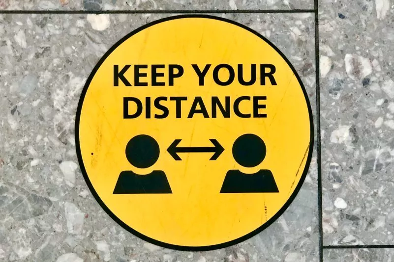 Ein Schild fordert in einem Flughafen auf, Abstand zu halten.