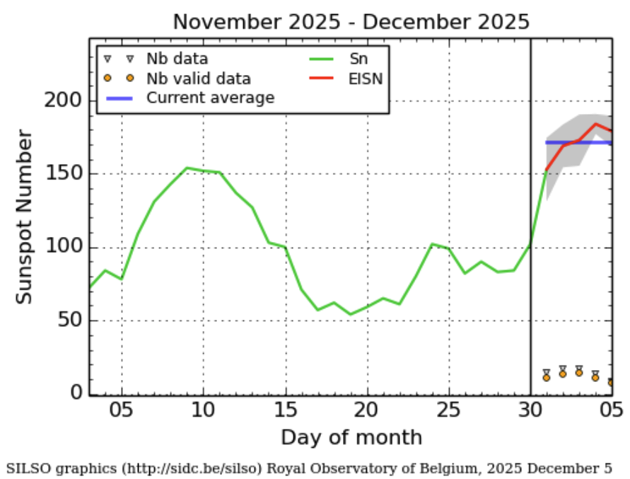 Anzahl der Sonnenflecken (EISN) von Anfang November bis 5. Dezember 2025.
